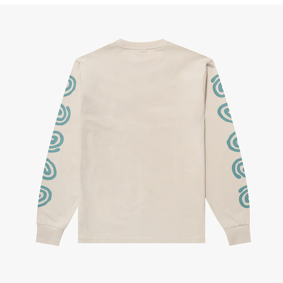 The Portal L/S T-Shirt in Beach. A relaxed fit, long sleeve tee crafted from premium GOTS Certified, 100% organic cotton with a classic ribbed crewneck and elasticated cuffs. Detailed with a printed design on the arms and branding on the chest.