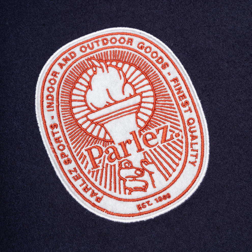 The Podium Jacket in Midnight Blue. A classic coach jacket crafted from a premium wool-polyester blend. Featuring a cinchable hem for an adjustable fit, two side pockets, and branded snap-button closure. Detailed with an seasonal felt patch at the chest and embroidery at the hem.