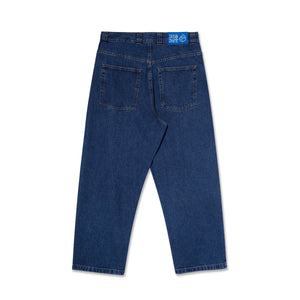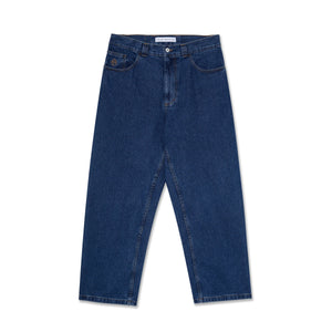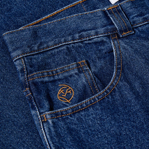High-waisted baggy jeans with tapered legs. Made from 100% dark blue cotton denim with a heavyweight 435 gsm feel. Features a YKK zipper, custom YKK button, and embroidered detail on the change pocket. Finished with a woven label on the waist.
