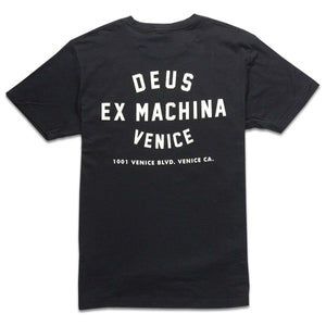 A standard-fit 150gsm cotton jersey tee, screen-printed with the Deus LA address on the back and Deus Skull artwork up front.