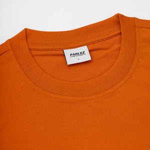 The Bloc Tee in Rust. A short sleeve tee made from GOTS certified, 100% organic cotton with a classic ribbed crewneck. Featuring an embroidered design on the chest.