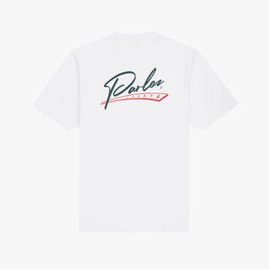 The Inning Tee in White. A short sleeve tee made from GOTS certified, 100% organic cotton with a classic ribbed crewneck. Featuring a large, printed graphic on the back and a smaller printed logo on the chest.