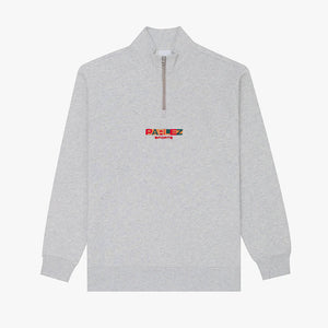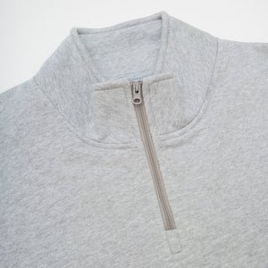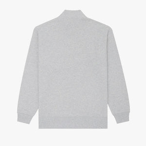 The Ora Quarter-Zip in Heather. A brushed back pullover made from a soft, organic cotton and recycled poly blend. Featuring a stand collar with 1/4 zip placket and ribbed trims. Detailed with an embroidered design on the chest.