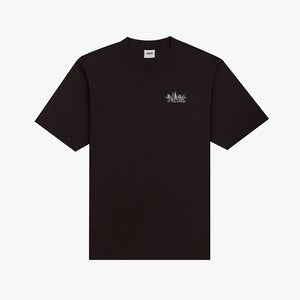 The Scape T-Shirt in Black. A classic short sleeve tee with a ribbed crewneck for structure and comfort. Cut from 100% GOTS-certified organic cotton and detailed with a printed skyline graphic on the chest and back.