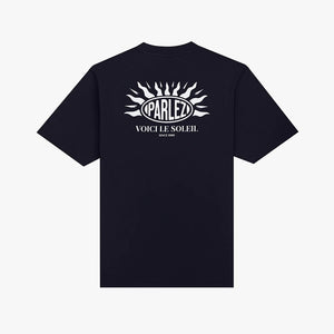The Soleil T-Shirt in Midnight. A classic short sleeve tee with a ribbed crewneck for structure and comfort. Cut from 100% GOTS-certified organic cotton and detailed with a printed graphic on the chest and back.