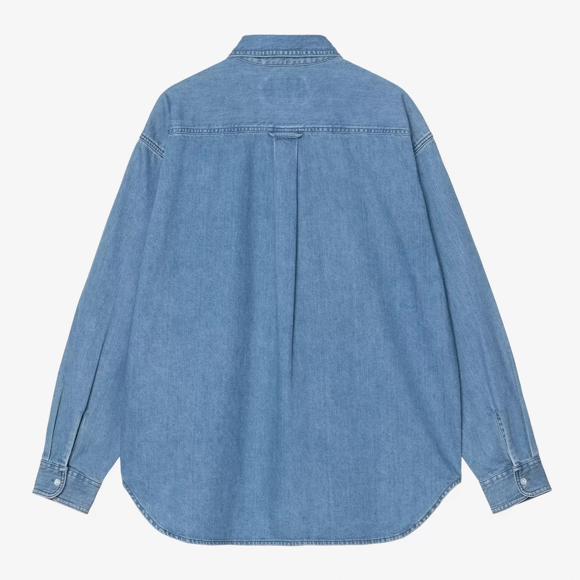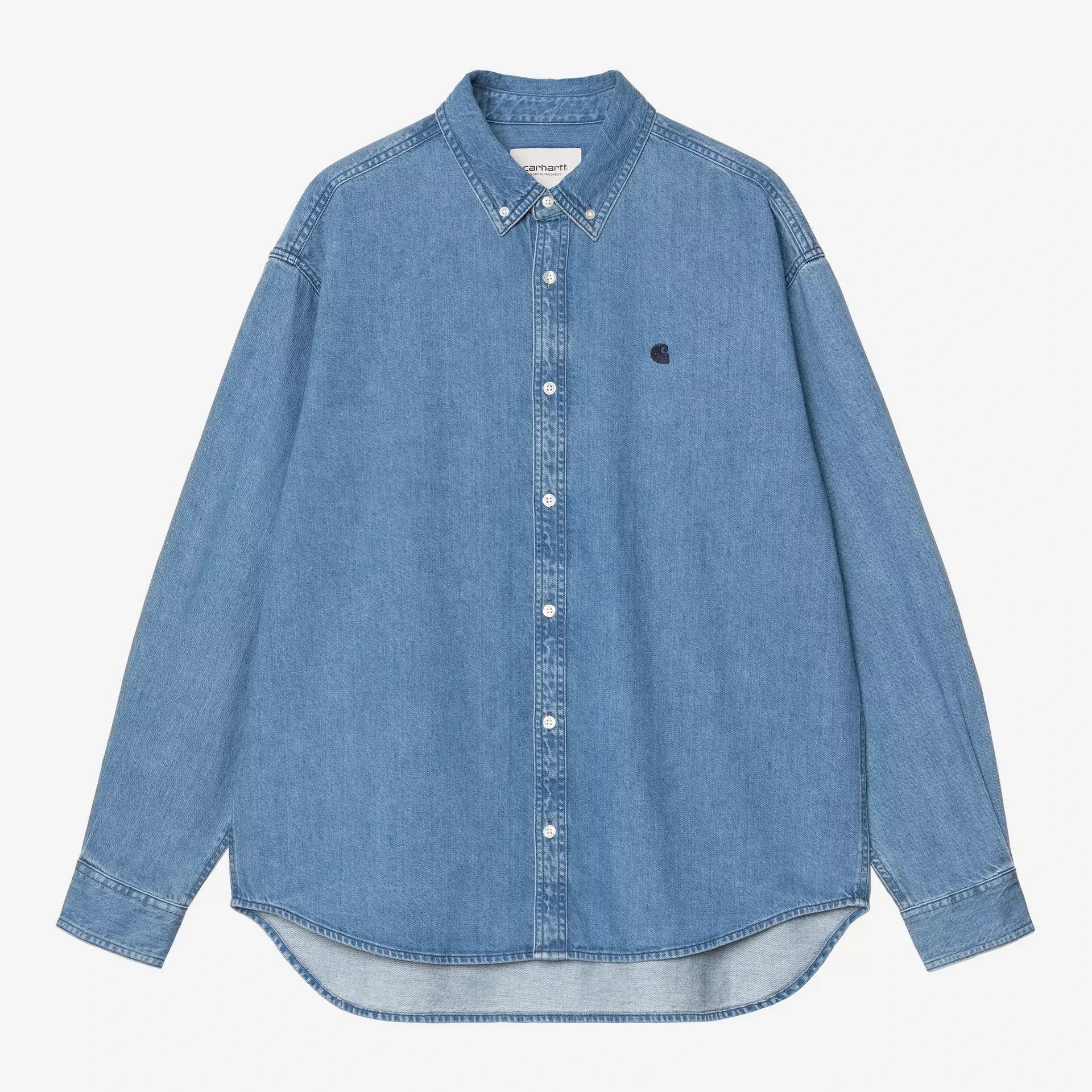 The L/S Lucas Shirt is made in a loose fit from midweight cotton denim. The item also has a buttoned front and collar. A woven 'C' Logo appears on the chest.