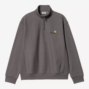 The Half Zip American Script Sweatshirt is constructed from a 12.3 oz cotton-polyester blend and brushed for extra softness and warmth, without losing breathability. The garment features a highneck with a zipper and a small logo. Appears in a loose, boxy silhouette.