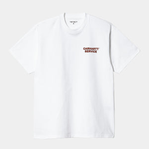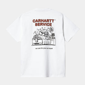 The S/S Car Repair T-Shirt is woven from midweight organic cotton jersey in a loose fit. Seasonal graphic prints appear on the chest and across the back.