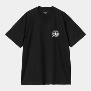 The S/S Inspector T-Shirt is woven from lightweight organic cotton jersey in a loose fit. Graphic prints appear on the chest and back.