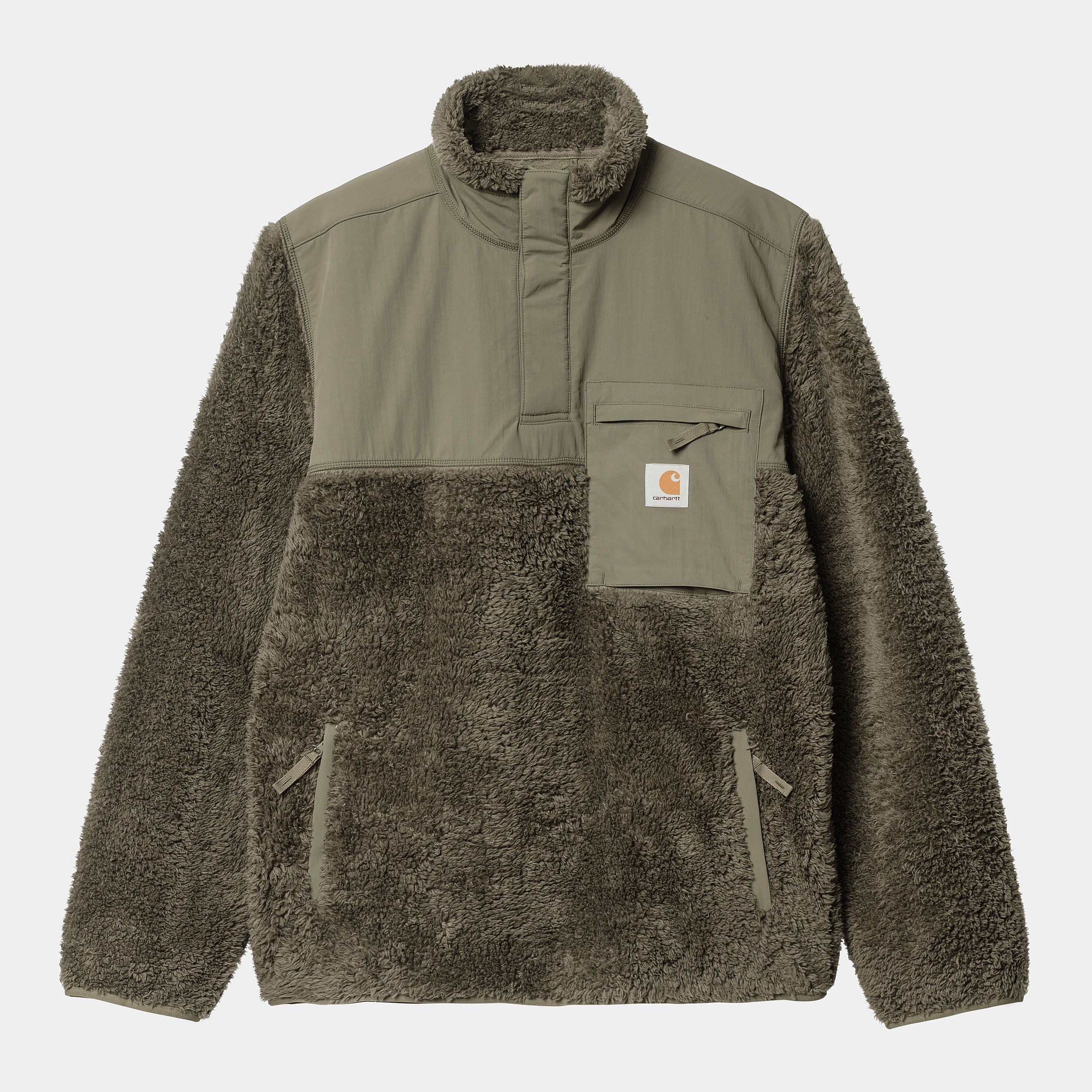 The Jackson Half Snap Sweat is cut in a loose fit from midweight polyester pile that has been brushed for softness. It features contrasting nylon panels on the chest, back yoke and elbows. It also has a high, snap-buttoned neck, a zipped chest pocket, and two zipped side pockets. A woven Square Label appears on the front.