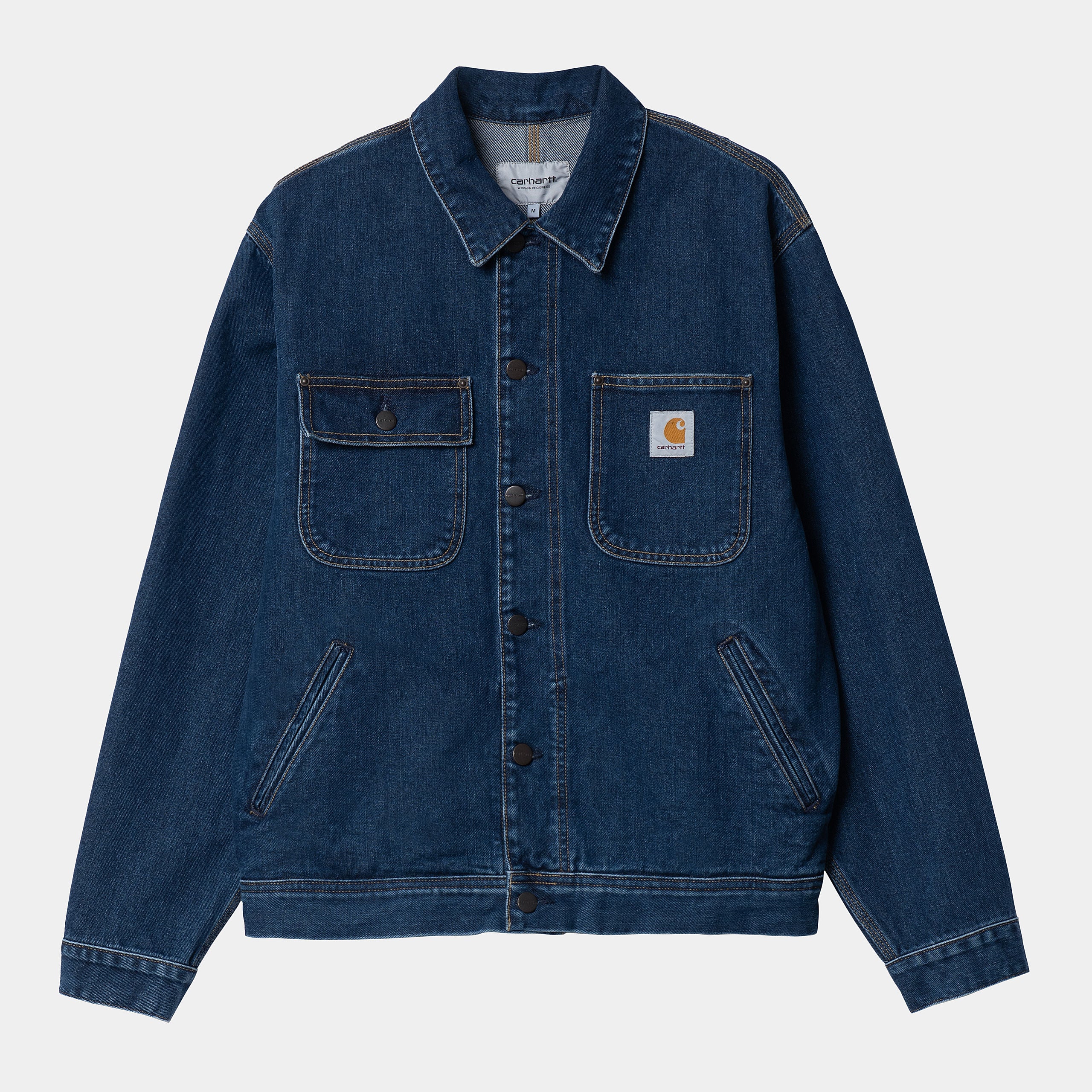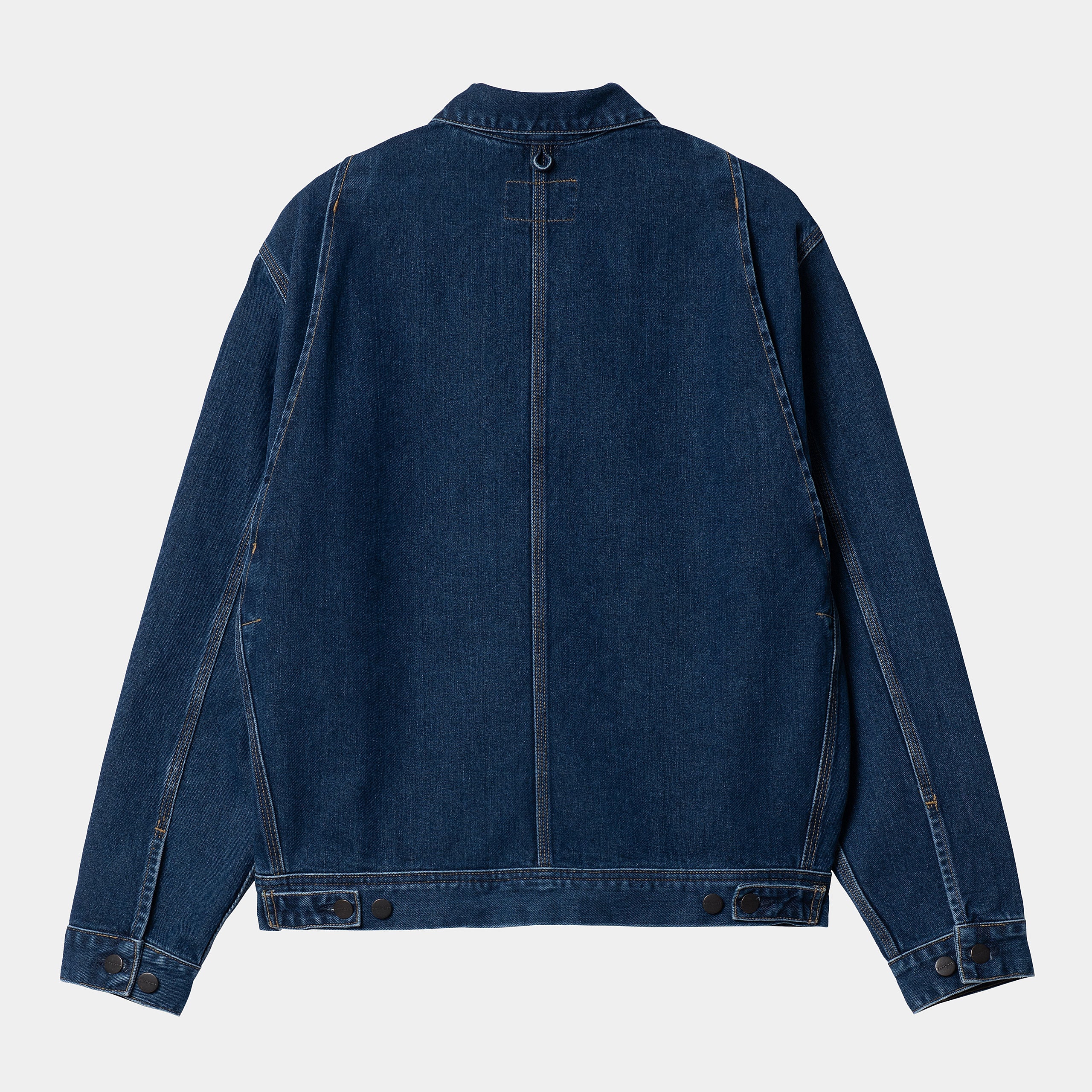 The Saledo Jacket is made of Maitland denim, which is a heavyweight cotton fabric. It comes in several iterations ranging from a 'light used wash' version, resulting in a unique finish that is light in colour, to a stone-washed version, offering a subtly worn-in appearance. The garment combines elements from both the Michigan Coat and Detroit Jacket, such as triple stitching, and pocket and collar detailing. Pleats at the back accentuate the style’s loose, boxy fit. A woven Square Label completes the design.