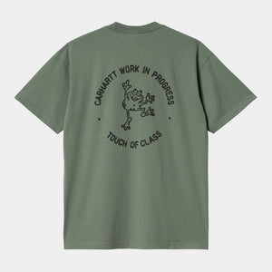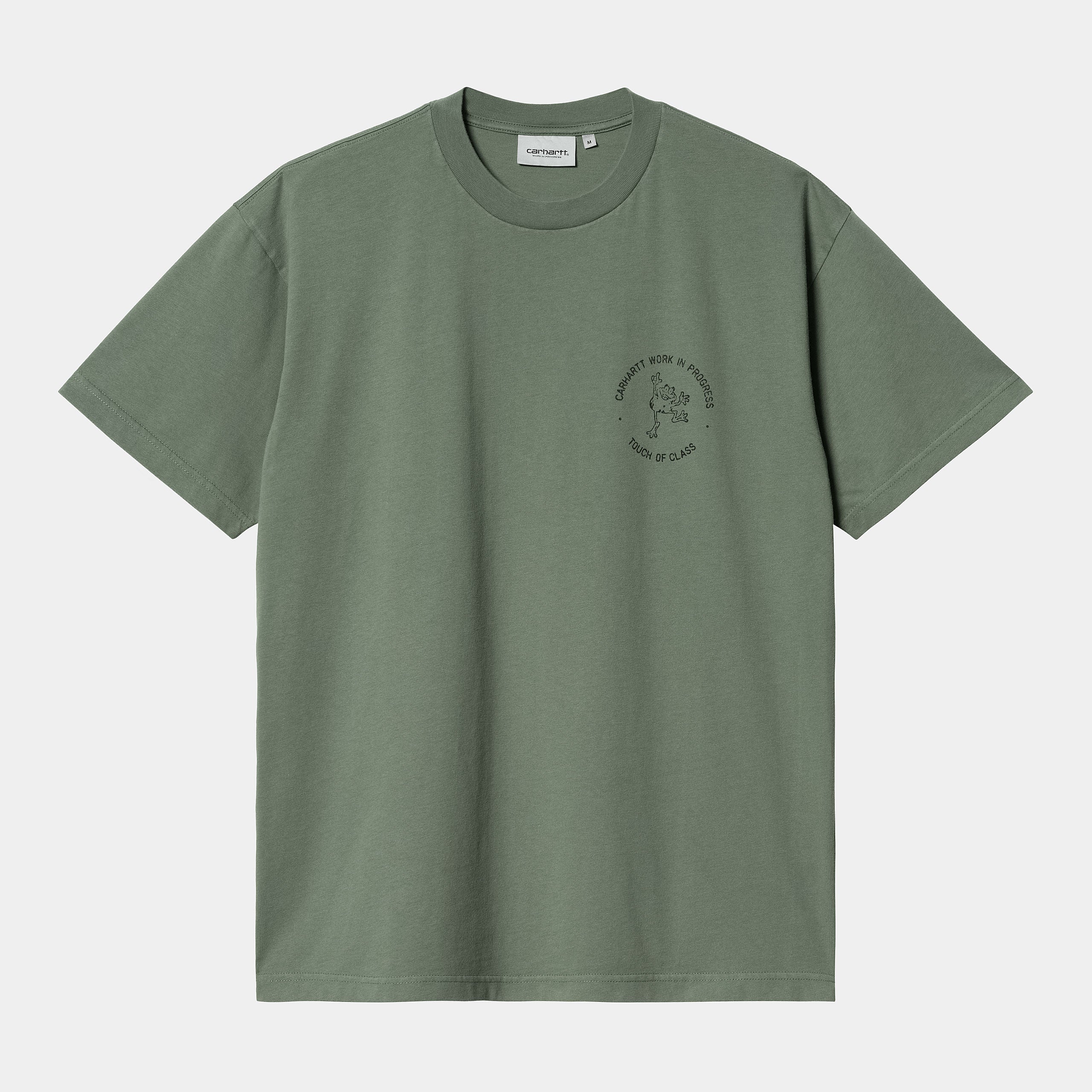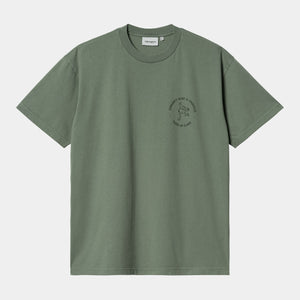 The S/S Stamp T-Shirt is woven from lightweight cotton jersey in a loose fit. Graphic prints appear on the chest and back.