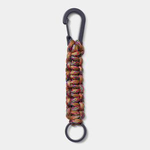 The Tour Cord Keychain has a knotted cord design made from recycled polyester. It features a branded, aluminum alloy carabiner on one end and an iron keyring on the other.