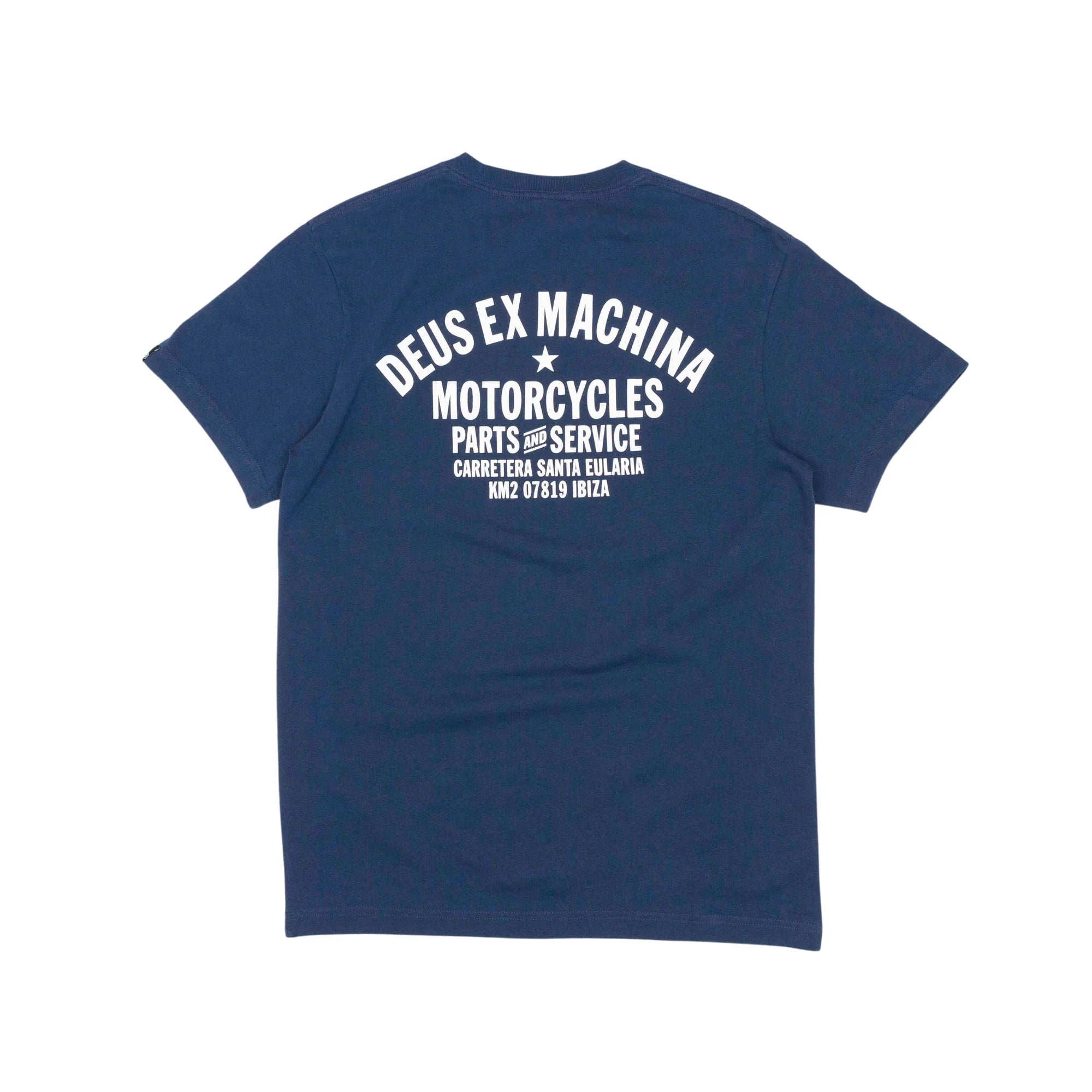 This mens Navy Blue tee features a front Deus shield print and a back Ibiza Address print on soft 190gm Cotton Jersey.