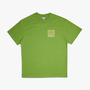Box fit t-shirt with chest and back print, 50% recycled cotton 50% recycled poly jersey fabrication with heavy enzyme stone wash