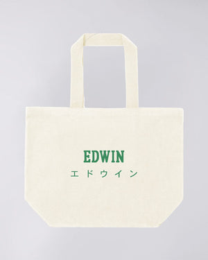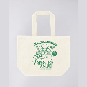 The EDWIN Tote Bag Shopper is a 100% cotton shopper totebag in a white natural colour, with a "Discrete Services - Spector Tanuki " graphic printed on the front and EDWIN graphic printed back.