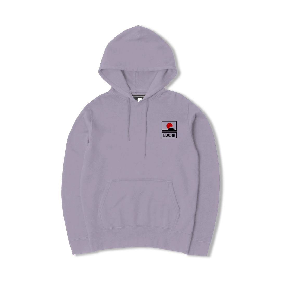 The Edwin Sunset On Mt Fuji Hoody is cut in the regular Edwin fit. It's made from a heavy 100% cotton fleece with screen printed graphic details. Finished with ribbed cuffs and hem, kangaroo pocket and drawstrings in the hood.