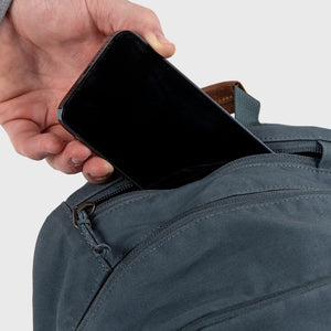 Simple and durable everyday backpack made from durable G-1000 HeavyDuty Eco in recycled polyester and organic cotton. Simple design and practical details make it perfect for commuting or everyday outings. The main compartment is spacious with a zippered opening and a padded compartment for a laptop computer (up to 15 inches in size). A little fleece-lined pocket with a zipper has room for sunglasses, a phone etc. There is also a zippered front pocket and two side pockets for drink bottles and other items you want to keep close at hand. Comfortable padded shoulder straps and foam frame sheet. Handle with leather grip. Volume: 20 litres.