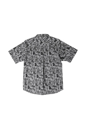 Party starter! Casual fit, short sleeve button up shirt, stand collar with interior logo jacquard tape, single chest pocket, dyed to match pearlized buttons with satin finish, back yoke panel with box pleat, curved hem.