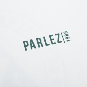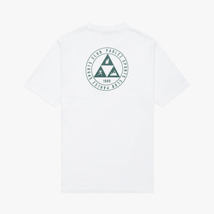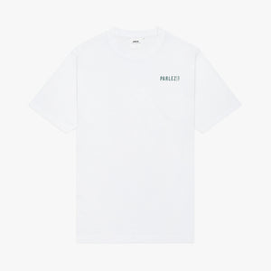 The Marathon T-Shirt in White. A short sleeve tee constructed from premium 100% organic cotton with a classic ribbed crewneck. Finished with printed chest branding and a large back design in Teal.- 100% GOTS Certified Organic Cotton - Pre-shrunk - Short Sleeve - Ribbed Crewneck - Printed Chest & Back Design