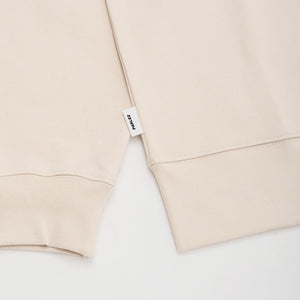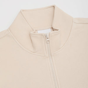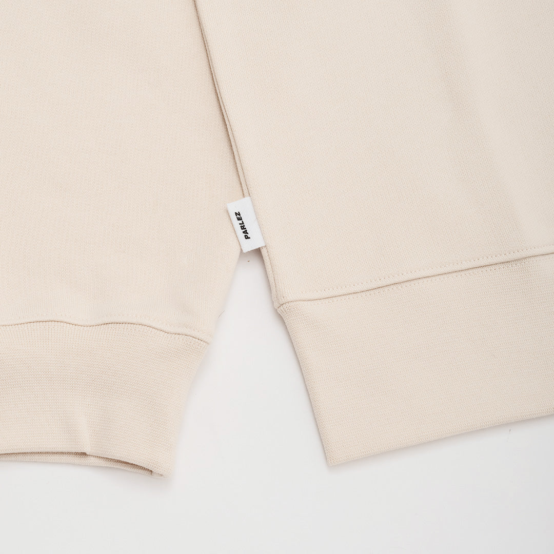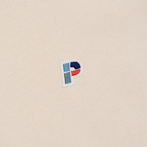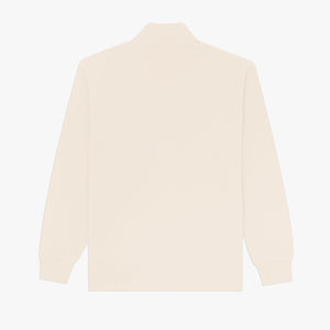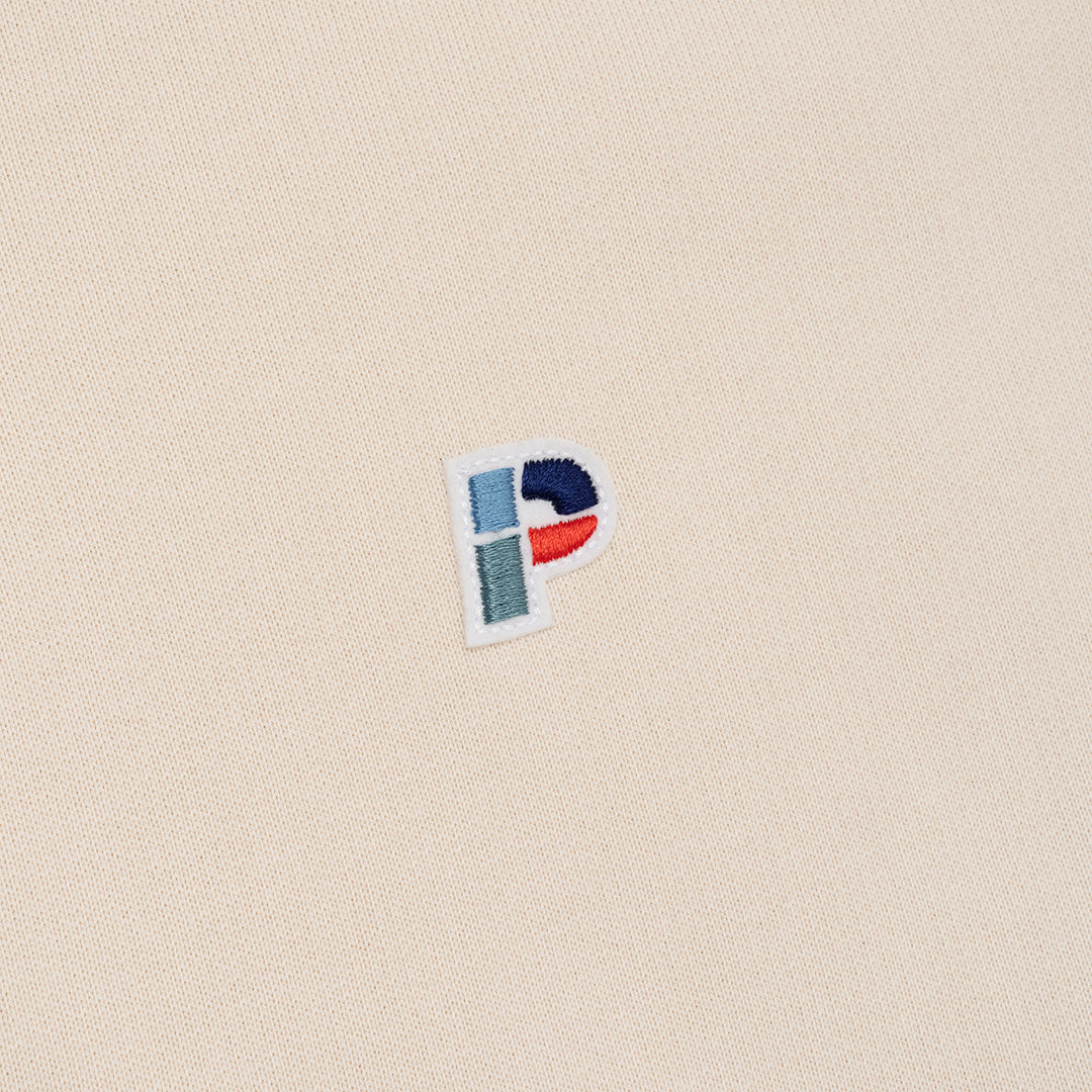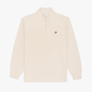 The Pantego ¼ Zip in Ecru. A brushed-back quarter-zip, constructed from GOTS Certified 100% organic cotton. Featuring a zip-up placket with a stand collar and ribbed trims. Detailed with an embroidered 'P' patch on the chest.