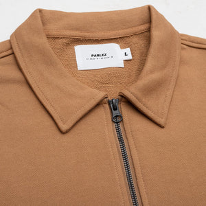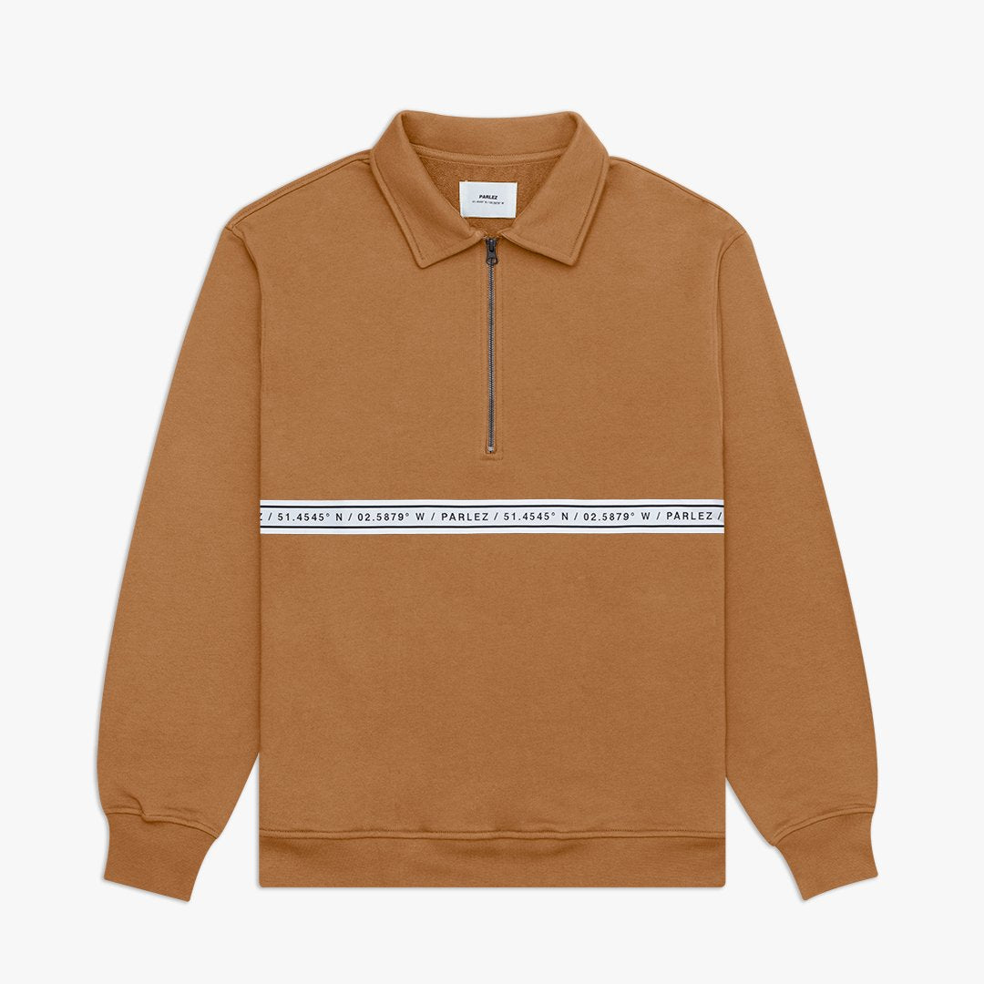 The Payne ¼ Zip in Light Brown. A loopback pullover with set-in sleeves, ribbed trims and a quarter-zip placket. Constructed from a premium loopback cotton and finished with branded Nylon tape around the chest.