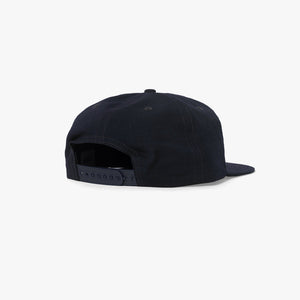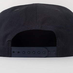 The Ramble 6 Panel in Navy. A low profile snapback made from a durable 100% organic cotton ripstop with embroidered eyelets and adjustable snap closure. Detailed with an embroidered design on the front.