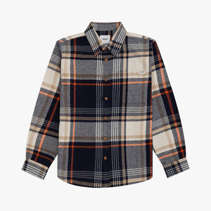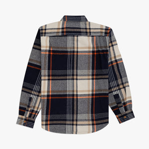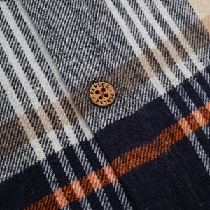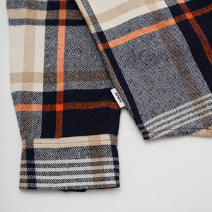 The Rotan Shirt in Navy. A long sleeve, checked shirt made from a soft, recycled & organic blend. Featuring an all-over check, branded coconut buttons and a curved hem. Detailed with a patch pocket on the chest with a branded woven label.