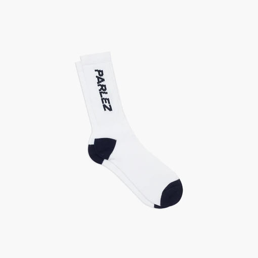 The Spar Socks in Navy. Thick ribbed sports socks, constructed from a durable, organic cotton blend fabric. Finished with an intarsia Logo on the cuff in Navy.
