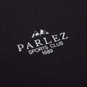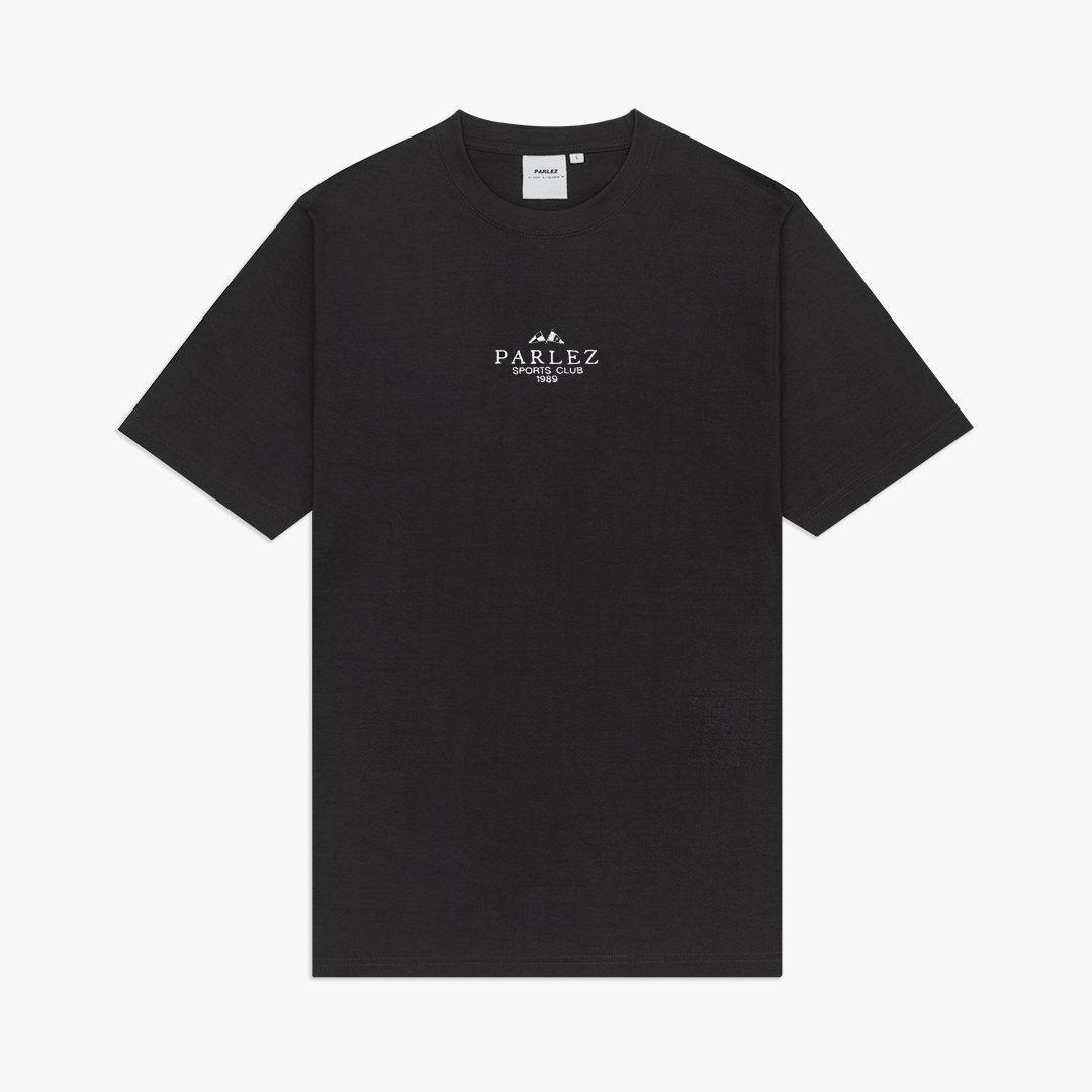 The Sports Club T-Shirt in Black. A short sleeve tee constructed from premium 100% Organic Cotton with a classic ribbed crewneck. Finished with an embroidered flag design centered on the chest.