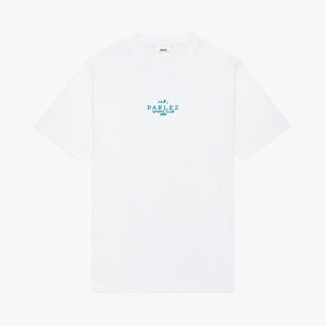 The Sports Club T-Shirt in White. A short sleeve tee constructed from premium 100% Organic Cotton with a classic ribbed crewneck. Finished with an embroidered flag design centered on the chest.