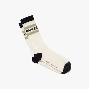 The Strive Socks in White & Midnight. Thick, ribbed sports socks made from a soft, organic cotton blend. Featuring a jacquard design around the cuff and a printed logo & co-ordinates on the sole.